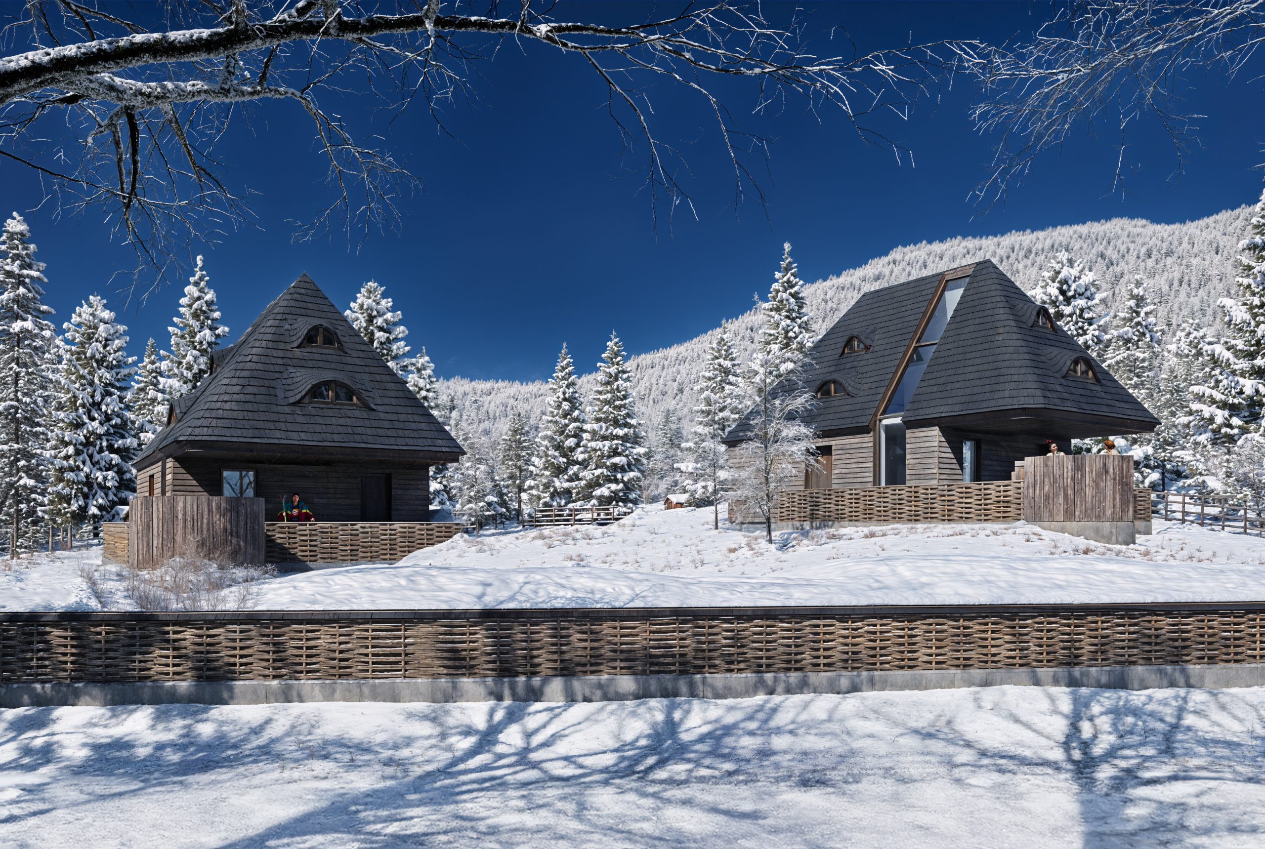 Nestled amidst a breathtaking landscape, this charming forest retreat features two cozy, traditional-style Airbnb houses that blend modern design with the timeless appeal of high-altitude architecture. The exterior, clad in warm wood with pitched roofs, exudes rustic charm, while expansive windows frame stunning views of the surrounding lake and forest.